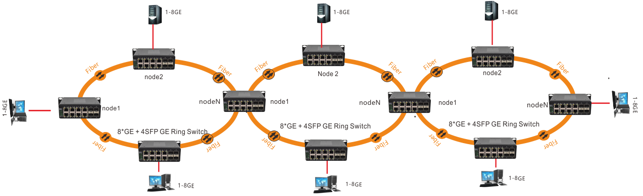 ◆ Support a variety of fiber optic network structure: point to point star chain ring network redundancy (support multi-ring combination) and can be combined for more complex network topology to support a variety of fiber network structure;