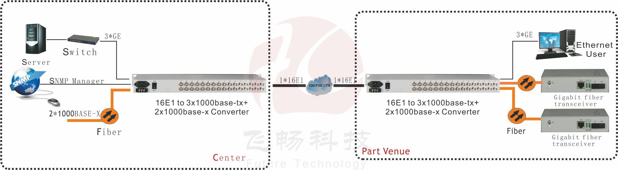 The device using reverse direction multiplexing technology to bundle for multiple E1 to transmit the Ethernet data of 3Channel 1000base-TX and 2x1000base-X. It can realize 1~16 E1 convert between Ethernet optical interface to make E1 channels interconnected with Ethernet optical interface. Using GFP encapsulation support the LCAS (link capacity adjustment scheme) and LAPS protocol. this device can support 1-16Channel E1 channel configuration can automatically detect the number of E1 and select the E1 available. It allows E1 lines transmission time 1channel/4channel/8channel/16channel Ethernet bandwidth is 1984Kbit/s7936Kbit/s15872 Kbit/s31744Kbit/s.