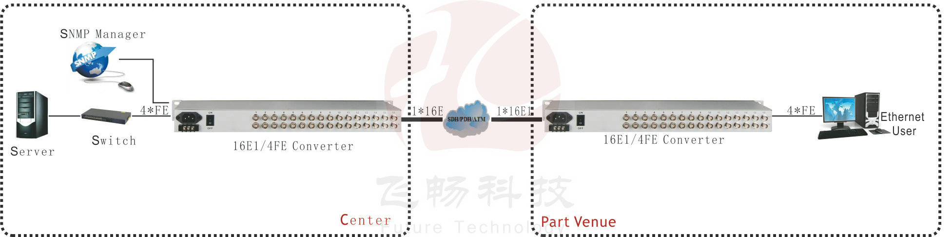The device using reverse direction multiplexing technology to bundle for multiple E1 circuits to transmit the Ethernet data of 4Channel 100base-TX.It can realize 1~16 E1 channel to convert between Ethernet optical interface to make E1 channels interconnected with Ethernet optical interface. Using GFP encapsulation support the LCAS (link capacity adjustment scheme) and LAPS protocol. this device can support 1-16Channel E1 channel configuration can automatically detect the number of E1 and select the E1 available. It allows E1 lines transmission time 1channel/4channel/8channel/16channel Ethernet bandwidth is 1984Kbit/s7936Kbit/s15872 Kbit/s31744Kbit/s.