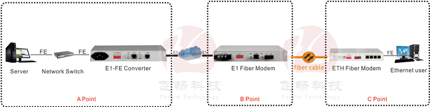 Ø Can form the structure: Ethernet E1 Bridge(A)---E1 Optical Fiber Modem(B)---Ethernet Optical Fiber Modem (C)