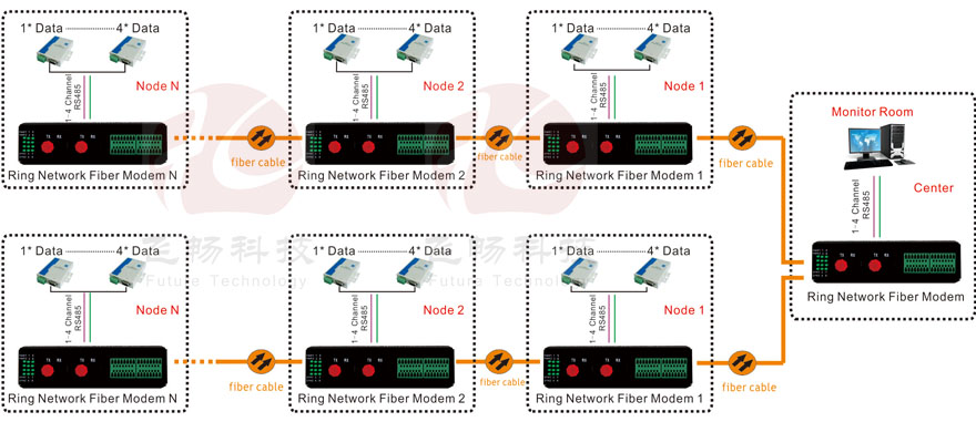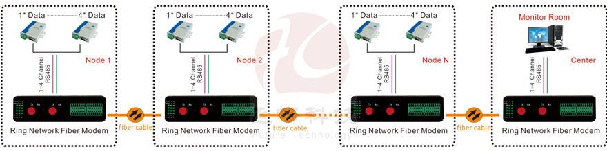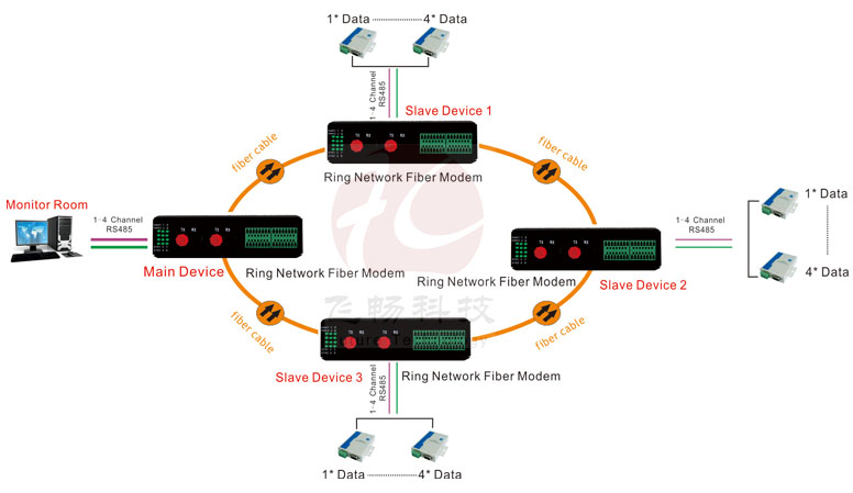 Ring Optical data type provides 4 RS232 / 422/485 in the optical fiber transmission, support a variety of fiber optic network topologies: point to point communications, chain network, star and redundant ring network protection, self-healing network topology, and on this basis, the networking is more complex network topologies, with a self-healing ring network protection. The product breakthrough contradictory legacy serial interface communication distance and speed, but also to solve the electromagnetic interference, ground loop interference and lightning damage problems, greatly improving the reliability of data communications, security and confidentiality.