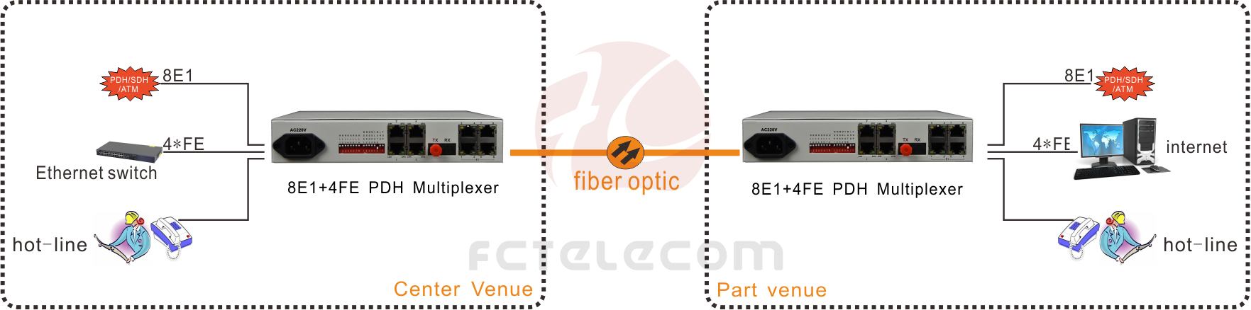 This series of equipment is developed by the company PDH optical fiber transmission for ultra-large scale integrated circuit based on the development of point-to-point optical transmission equipment. Provide 1 ~ 4 E1 interface, 1-4 10/100M Fast Ethernet interface (wire speed 100M). 4*FE Ethernet interface for the exchange port, can support VLAN division. Optional digital business phone.