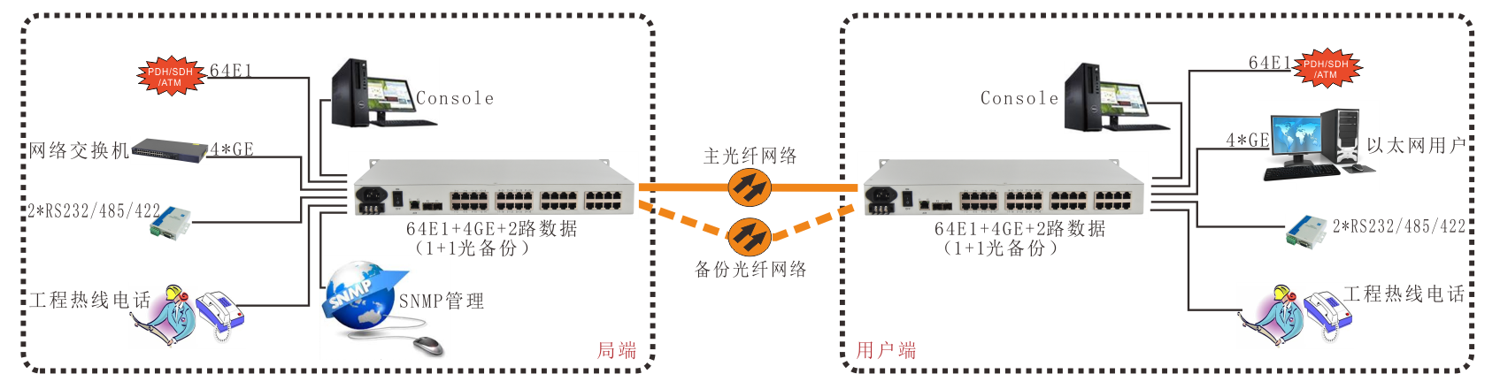 This device is the point-to-point optical transmission device developed on the basis of VLSI. The device  provides 1-64*E1 interface, 1-4*10/100/1000M Ethernet interface (Wire Speed 1000M) and 2 expansion interfaces. 4* Ethernet interface is switch interface, can support VLAN. 1 expansion interface can be used as the transmission channel of RS232/RS485/RS422 asynchronous data, dry contact signal, 1Channel digital business phone can be optional. It is very flexible. It has alarm function. The work is reliable, stable, and low power consumption, high integration, small size.