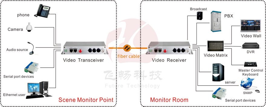 This digital video optical transceiver adopts digital video encoding and gigabit optical fiber transmission technology. The multi-channel single-direction bi-direction audio, video, data, telephone, Ethernet and switch real-time synchronization, no-distortion and high quality transmission is on the single-core or dual-core optical fiber. Complete digital video non-compression transmission technology, with video and data condition indicator, can monitor the system normal operation. It uses modular design, the user can flexibly select or customize configuration based on the scene occasion. Rack installation or desktop installation can be optional. This product is made up of optical transmitter and receiver. It can transmit simultaneously 1Channel forward direction video, audio, data, phone, E1, Ethernet and switch.