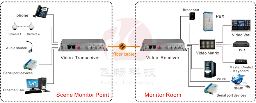 This digital video optical transceiver adopts digital video encoding and gigabit optical fiber transmission technology. The multi-channel single-direction bi-direction audio, video, data, telephone, Ethernet and switch real-time synchronization, no-distortion and high quality transmission is on the single-core or dual-core optical fiber. Complete digital video non-compression transmission technology, with video and data condition indicator, can monitor the system normal operation. It uses modular design, the user can flexibly select or customize configuration based on the scene occasion. Rack installation or desktop installation can be optional. This product is made up of optical transmitter and receiver. It can transmit simultaneously 4Channel forward direction video, audio, data, phone, E1, Ethernet and switch.