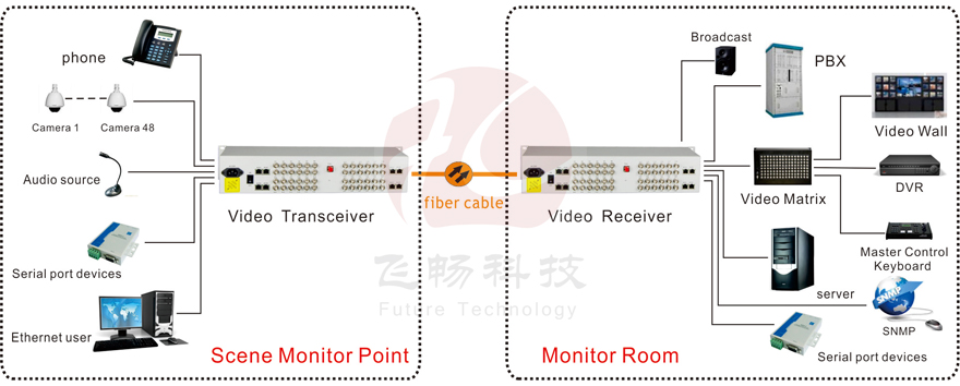 This digital video optical transceiver adopts digital video encoding and gigabit optical fiber transmission technology. The multi-channel single-direction bi-direction audio, video, data, telephone, Ethernet and switch real-time synchronization, no-distortion and high quality transmission is on the single-core or dual-core optical fiber. Complete digital video non-compression transmission technology, with video and data condition indicator, can monitor the system normal operation. It uses modular design, the user can flexibly select or customize configuration based on the scene occasion. Rack installation or desktop installation can be optional. This product is made up of optical transmitter and receiver. It can transmit simultaneously 48Channel forward direction video, audio, data, phone, E1, Ethernet and switch.