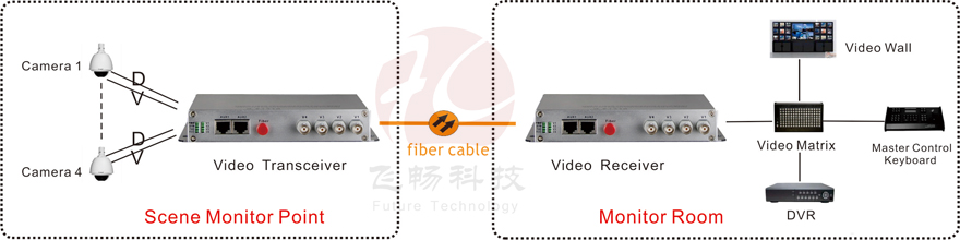 This digital video optical transceiver adopts digital video encoding and gigabit optical fiber transmission technology. The multi-channel single-direction bi-direction audio, video, data, telephone, Ethernet and switch real-time synchronization, no-distortion and high quality transmission is on the single-core or dual-core optical fiber. Complete digital video non-compression transmission technology, with video and data condition indicator, can monitor the system normal operation. It uses modular design, the user can flexibly select or customize configuration based on the scene occasion. Rack installation or desktop installation can be optional. This product is made up of optical transmitter and receiver. It can transmit 4Channel forward direction Video and 1Channel reverse direction RS485 data.