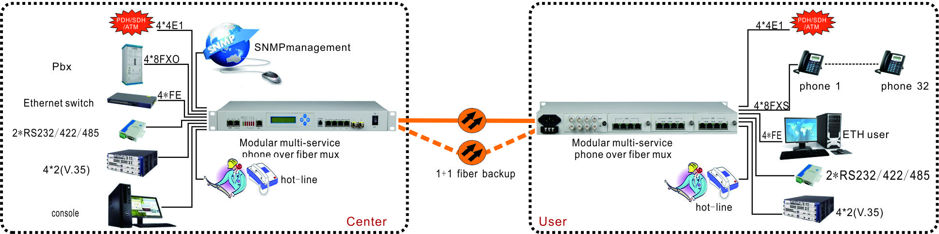 Description:LCD display,key control 4FE,With 4 multifunction slots, with ALS function,Console or SNMP,1+1 Back up Optic fiber max voice number:64