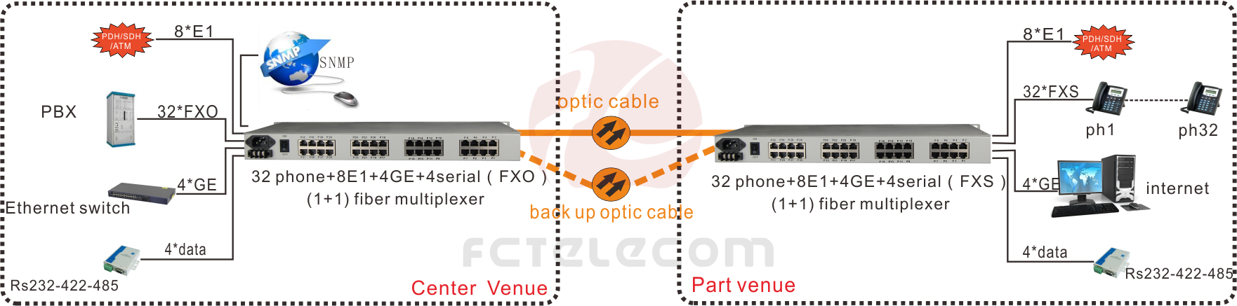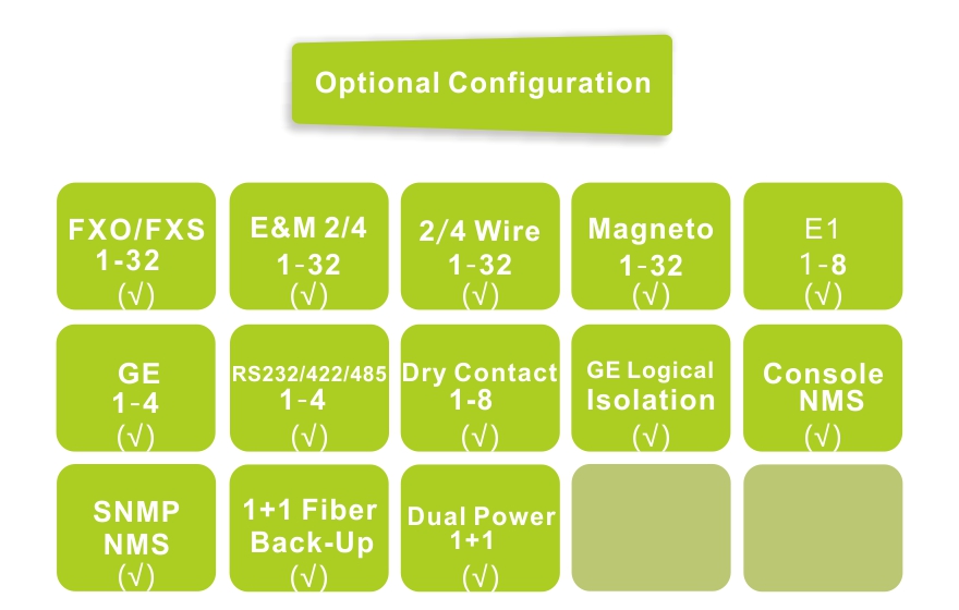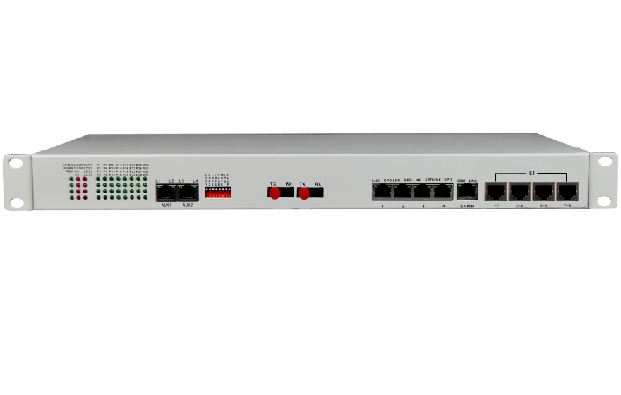 The Equipment provides 32*Voice, 1~8 E1 interface, 4*10/100/1000M Gigabit Ethernet interface(Wire speed 1000M), and four extended service interfaces. 4*GE interface for the Switch port, can support VLAN division. 4 expansion service interface can be used as RS232/RS485/RS422 asynchronous data /TTL signal/Dry Contact signal and other transmission channels, the application is very flexible.