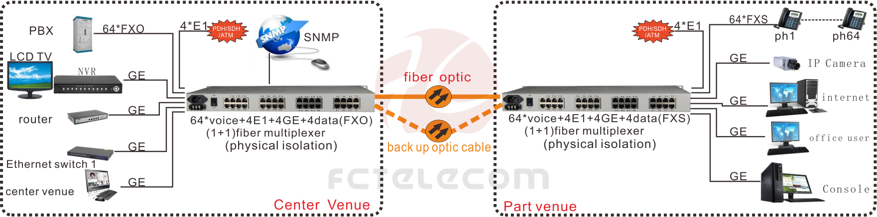 Fiber-64Voice + 4E1 + 4GE + 4RS232 Multiplexer