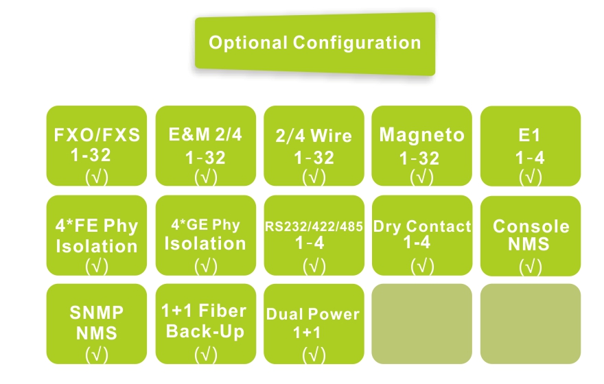 ◆  Voice port to support FXO/FXS/2-4 Wire E&M/2-4 wire Audio/Magnet phone interfaceFXO port plug into PBXFXS port is connected to the user's telephone;