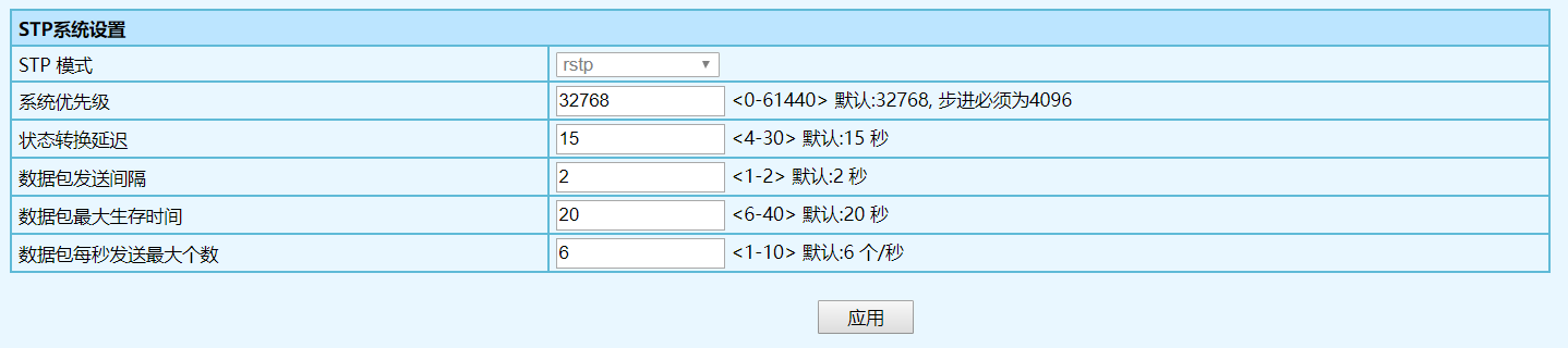 STP 模式 當前的 STP 模式,支持 RSTP,兼容 STP