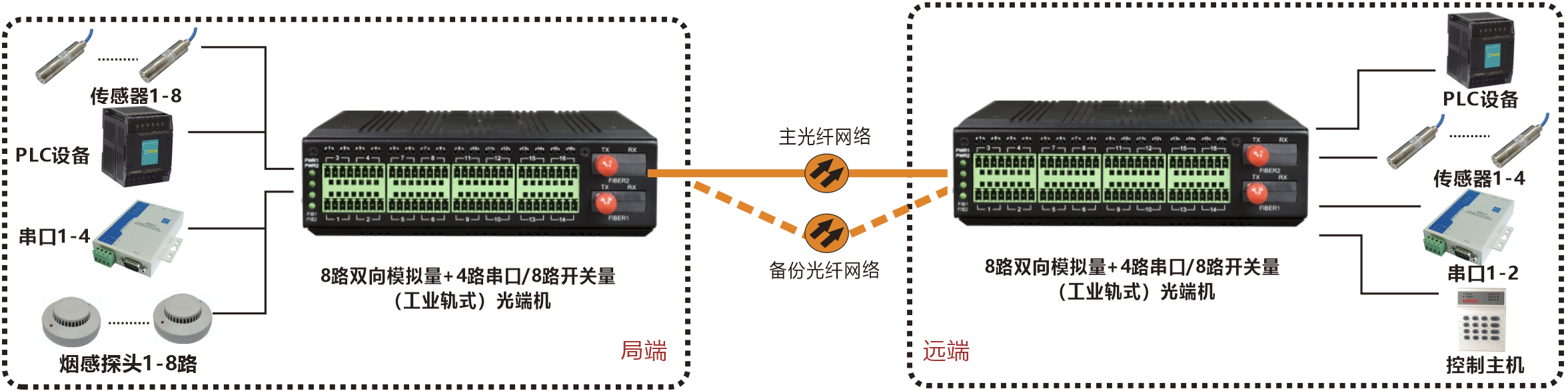 工業(yè)軌式 1-32路模擬量+開關量 1+1光纖備份 混合光端機 (帶斷纖保持功能)