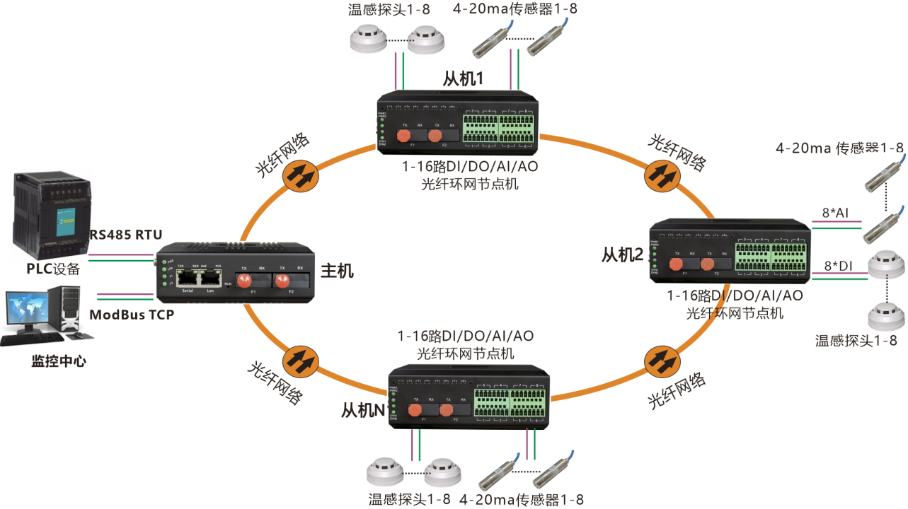 工業(yè)級環(huán)網(wǎng)型光端機(jī)提供每個節(jié)點最多16路DI/DO/AI/AO開關(guān)量模擬量在光纖中傳輸,支持多種光纖網(wǎng)絡(luò)拓?fù)浣Y(jié)構(gòu):點對點通訊、鏈型網(wǎng)絡(luò)、星型網(wǎng)絡(luò)及冗余環(huán)網(wǎng)自愈保護(hù)等拓?fù)浣Y(jié)構(gòu),并可在此基礎(chǔ)上組網(wǎng)為更復(fù)雜的網(wǎng)絡(luò)拓?fù)浣Y(jié)構(gòu),具有環(huán)網(wǎng)自愈保護(hù)功能。主機(jī)采用ModBus RTU與ModBus TCP雙上聯(lián)接口,方便現(xiàn)場實施。