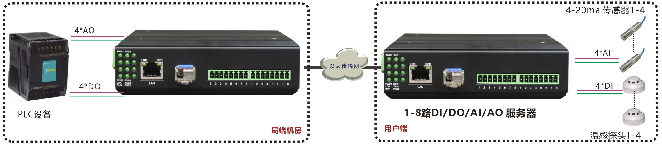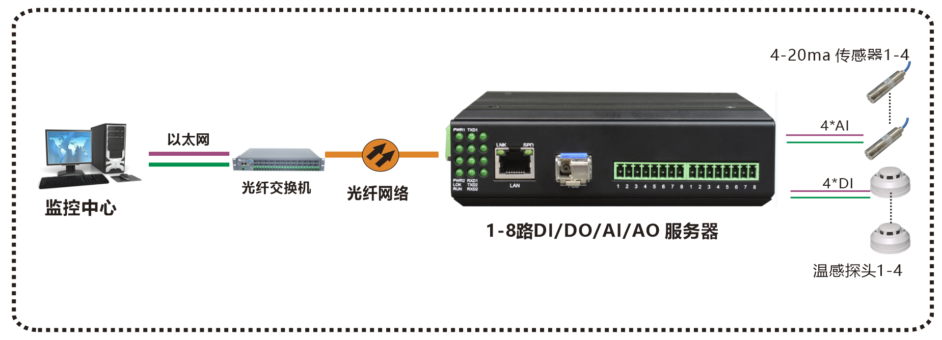 工業(yè)軌式1-8路DI/DO/AI/AO開關(guān)量模擬量服務(wù)器(帶1光1電交換口)