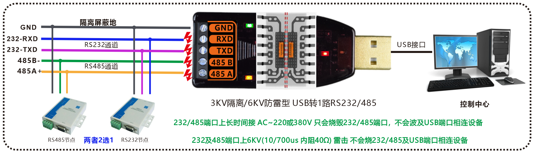 工業(yè)級(jí) 3KV隔離/6KV防雷型 USB轉(zhuǎn)1路RS232/485轉(zhuǎn)換器