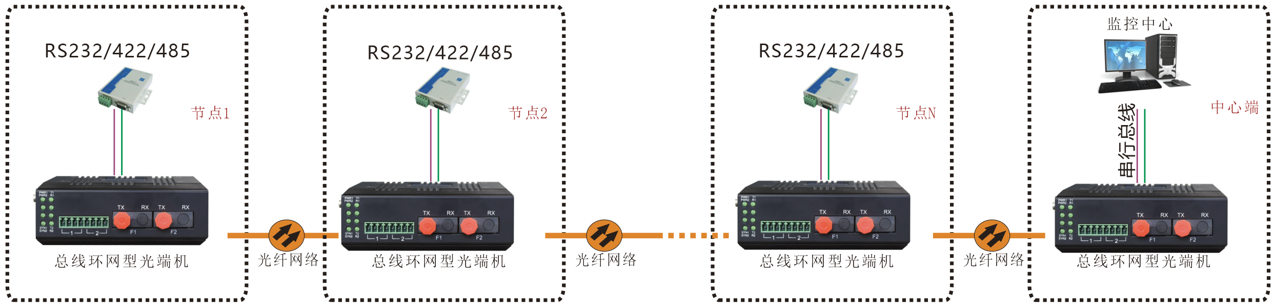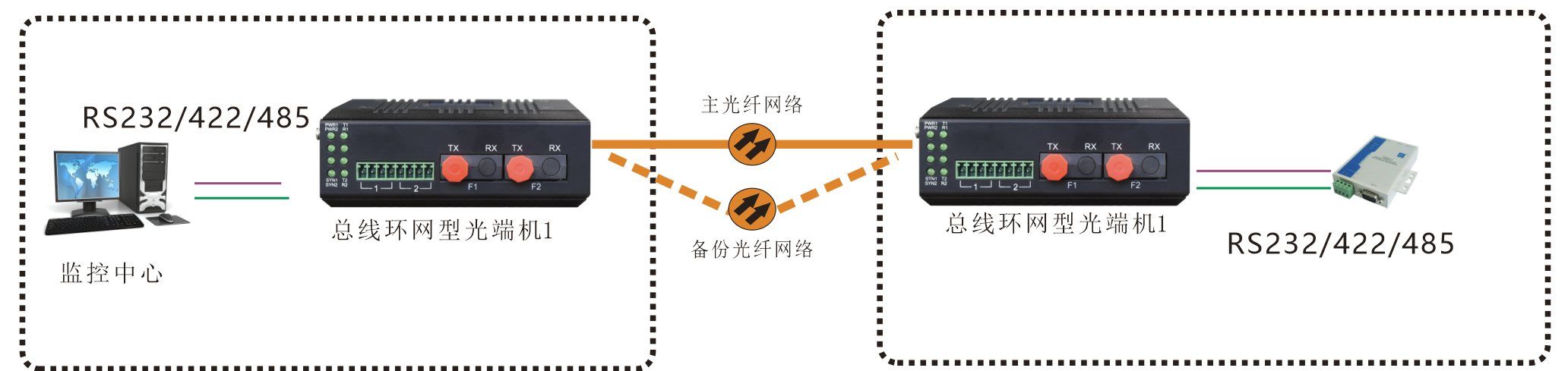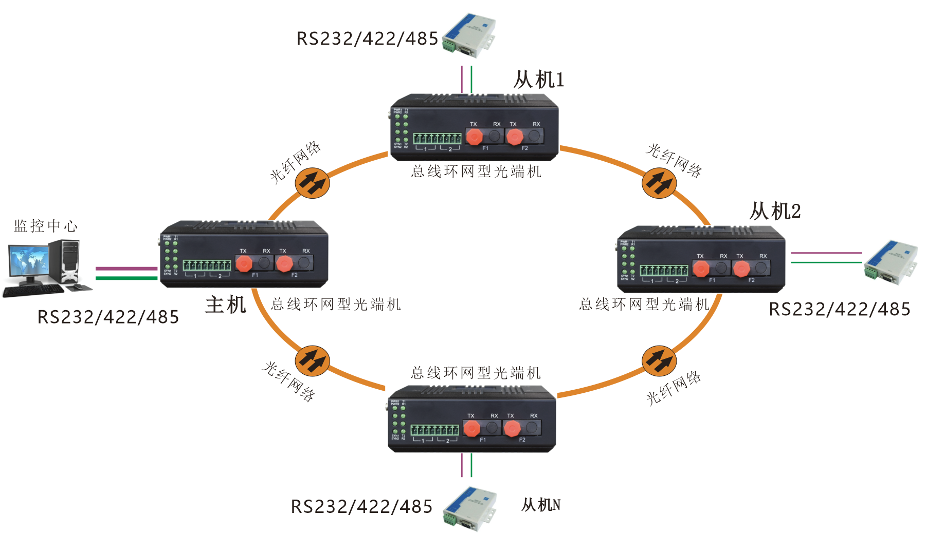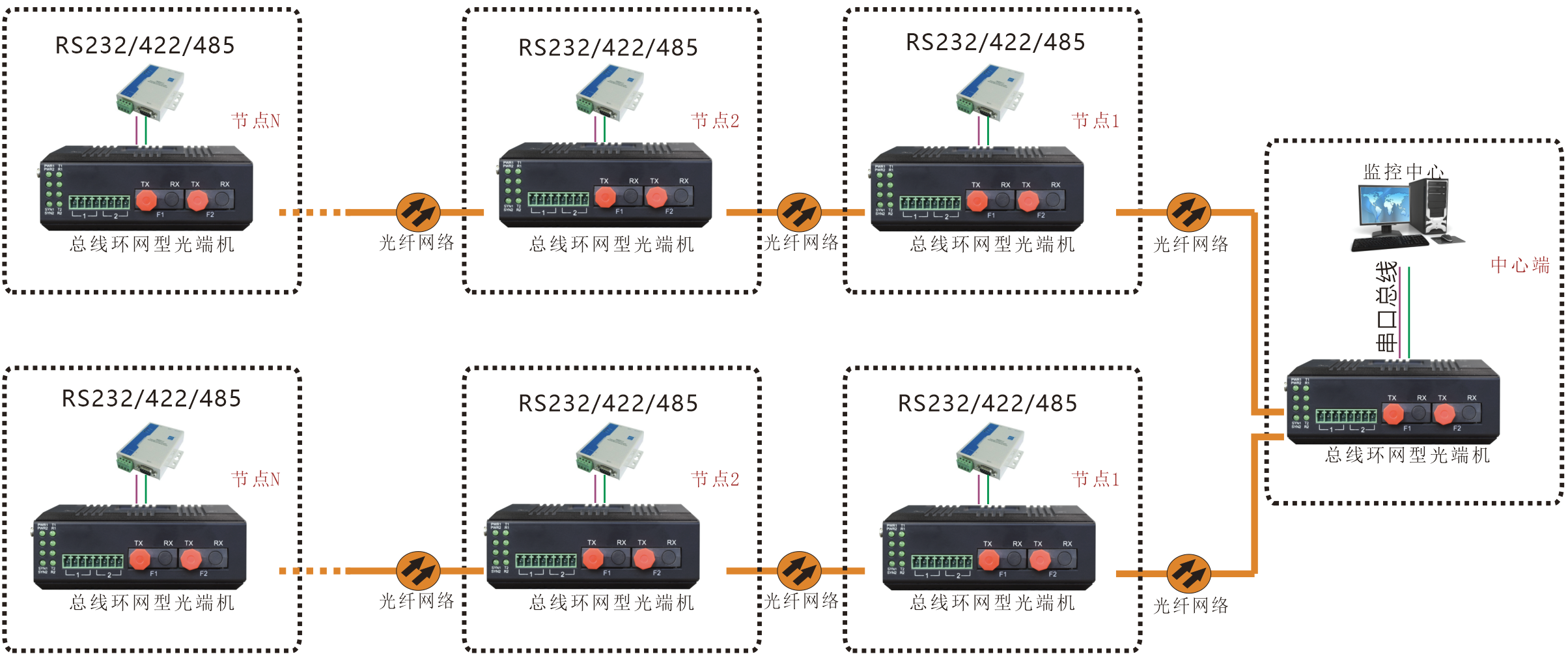 本產(chǎn)品支持多種光纖網(wǎng)絡(luò)拓?fù)浣Y(jié)構(gòu):點(diǎn)對點(diǎn)通訊、鏈型網(wǎng)絡(luò)、星型網(wǎng)絡(luò)及冗余環(huán)網(wǎng)自愈保護(hù)等拓?fù)浣Y(jié)構(gòu),并可在此基礎(chǔ)上組網(wǎng)為更復(fù)雜的網(wǎng)絡(luò)拓?fù)浣Y(jié)構(gòu)