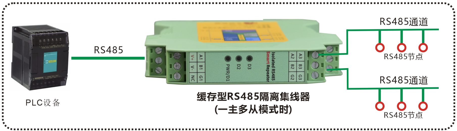 模塊化導軌式緩存型二主一從RS485隔離集線器