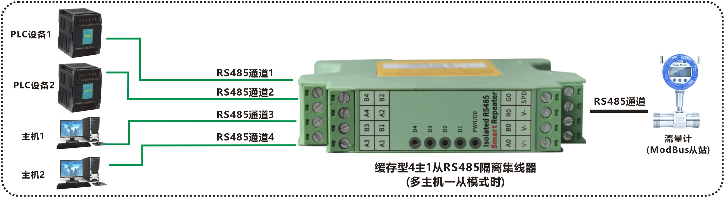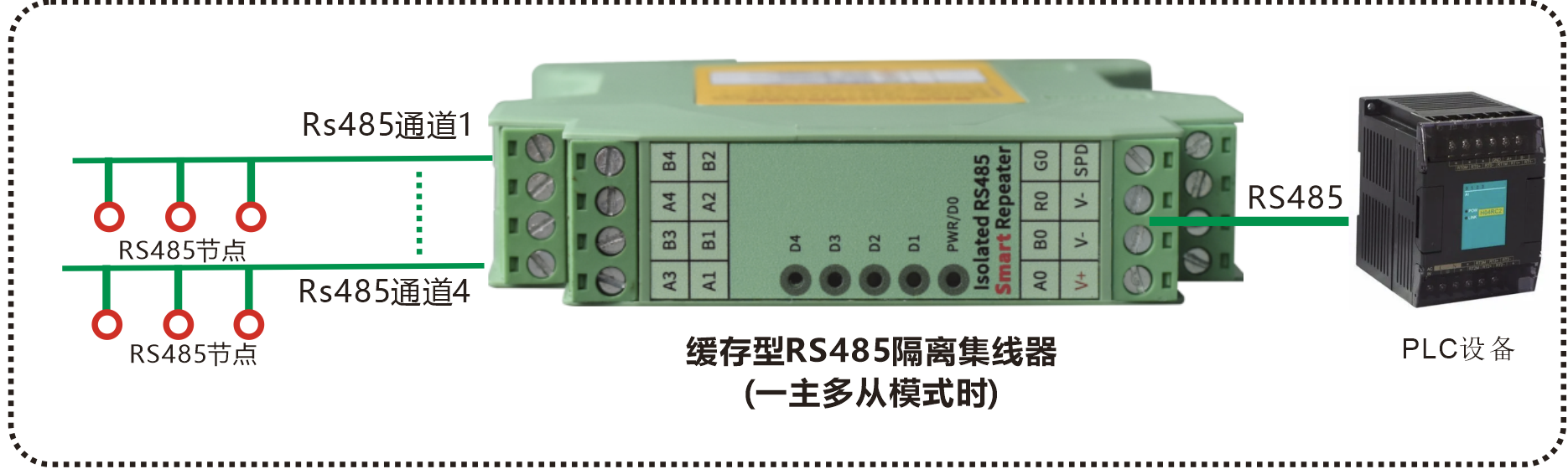 模塊化導(dǎo)軌式緩存型四主一從RS485隔離集線器