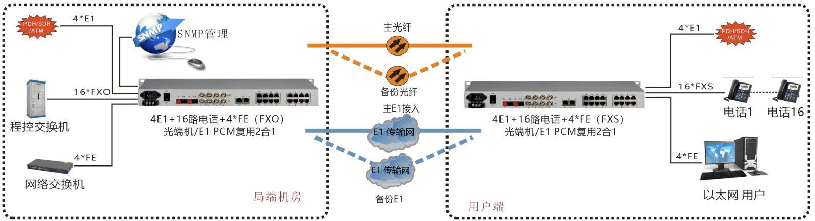 16路電話+4E1+4xFE (光纖1+1備份 E1 1+1 備份) 光端機/E1 PCM復用